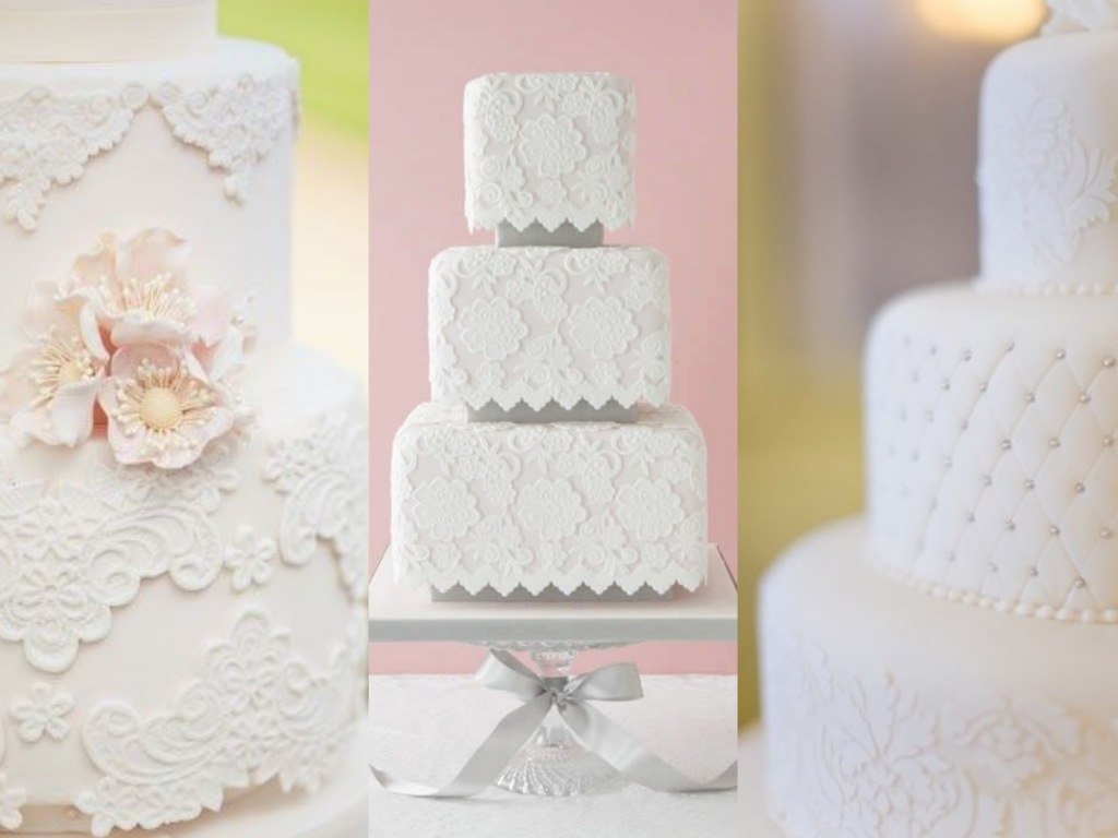 Dwa motywy, które przyciągają moją największą uwagę to koronkowy wzór na torcie, który może się pięknie łączyć z koronką sukni ślubnej, oraz tort z pikowanym wzorem.
