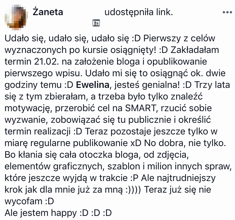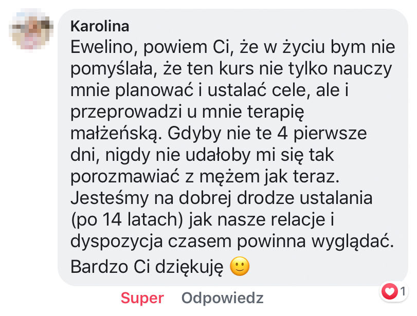 „Prywatnie jestem szcześliwą żoną i spełnioną mamą” może i brzmi banalnie, ale dokładnie tak czuję, nawet mimo tego, że momentami to spełnienie i szczęście są testowane przez moją ekipę i wymagają sporo mojej pracy nad samą sobą ;) Bo tak, ja też nieustannie pracuje nad swoim rozwojem i to właśnie dlatego zachęcam do tego i Ciebie - bo wiem, jak wiele zmienia to w moim życiu!